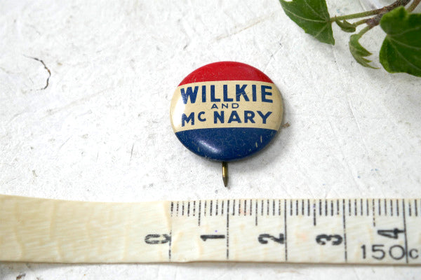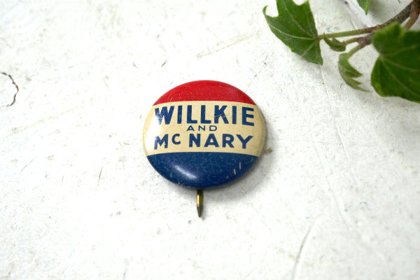 アメリカ合衆国、インディアナ州、インディアナポリスで見つけました・・・"WILLKIE AND Mc NARY”ヴィンテージ・アメリカ・大統領選挙・共和党議員・缶バッジです。