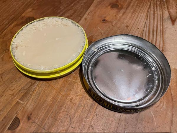革靴のお手入れなどに使用する革製品用のシューポリッシュ(靴磨き・レザー磨き)が入った、フタ付きのブリキ缶になります。