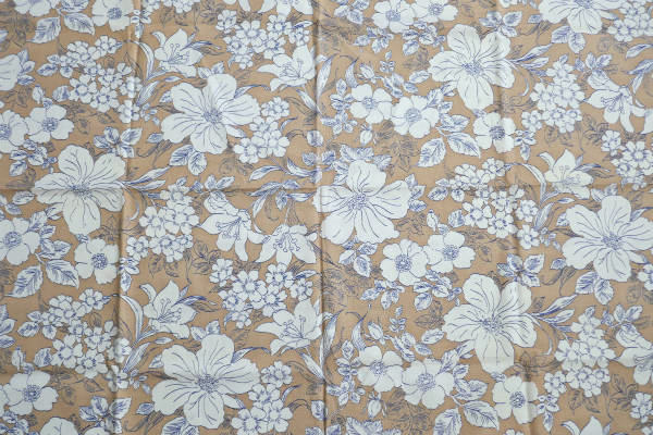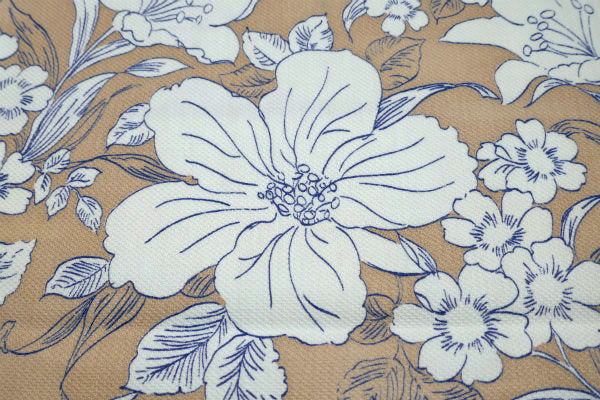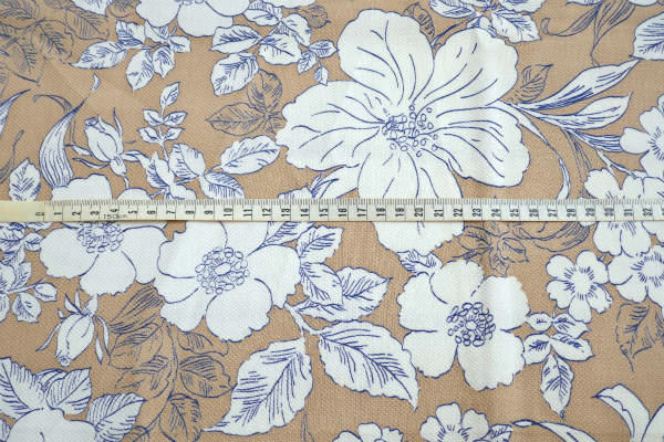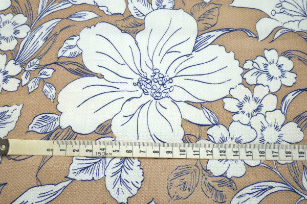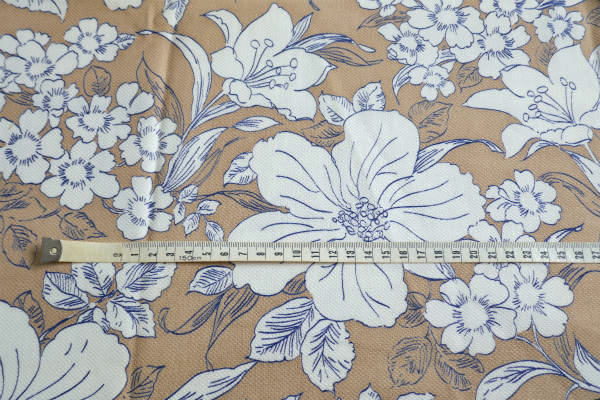 ベージュカラーベースに、大中小の白いハイビスカスの総柄プリントです。
