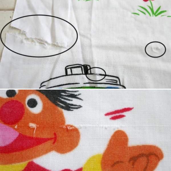経年による多少の使用感・一部に薄いヨゴレ・左端上部に約9㎝程のヤブレ・2箇所程に小さなヤブレ穴・一部に生地のツッパリ箇所等が見られますが、プリントの発色良く、生地もしっかりしております。