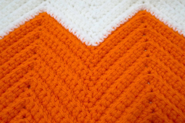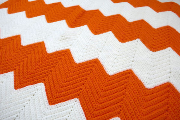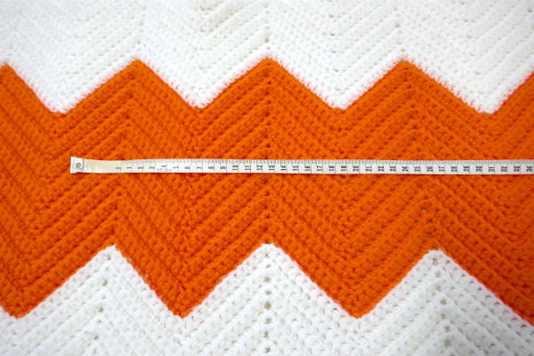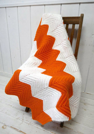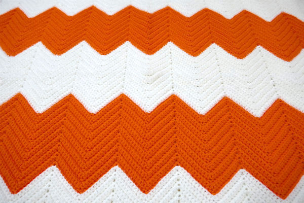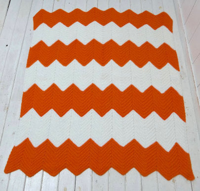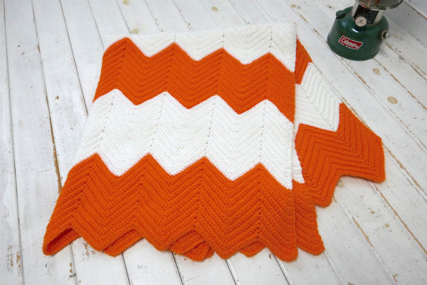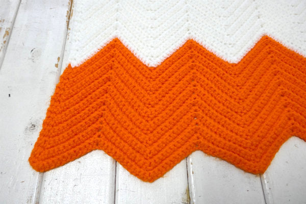 オレンジ×ホワイト 波デザイン 手編みニット ヴィンテージ ブランケット ハンドメイド ひざ掛け