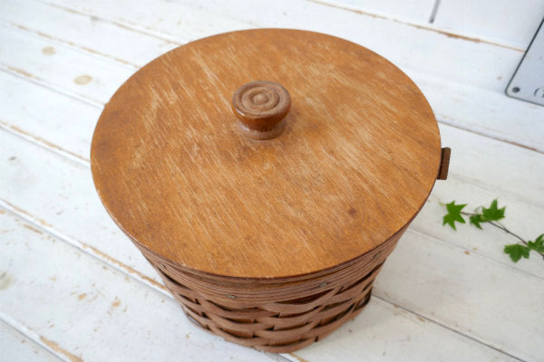 木製の編み込みが可愛い、ラウンド型の蓋付きバスケットです。