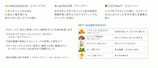 カカオバターをベースにしたシルキーなテクスチャーで、保湿力・整肌力が高い厳選されたオーガニックボタニカル成分を12種ブレンドしたボディローションです。