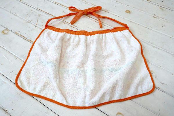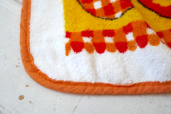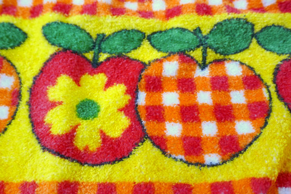 ホワイトベースのパイル地に、上段はオレンジ色の花柄&チェック柄、下段にはリンゴ柄が入った、カラフルポップな色使いのレトロ可愛いデザインです。