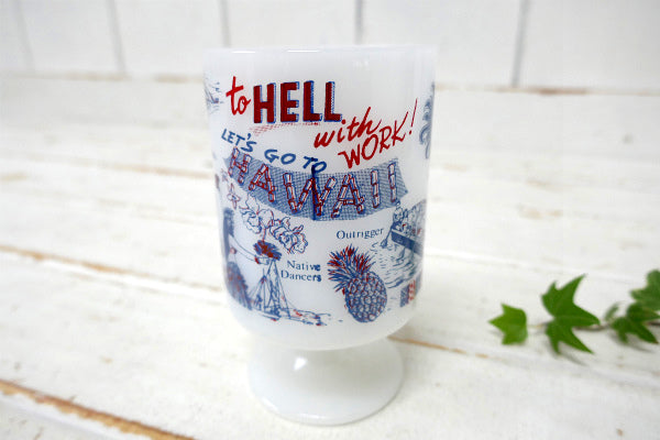 ホワイトボディの脚付きミルクガラスに、ダイアモンドヘッドやサンセットクルーズ・フラダンサー・アウトリガーカヌー・パイナップルなど、ハワイを代表する名所やアクティビティのモチーフがプリントされた、ハワイ好きにはたまらないデザインです!