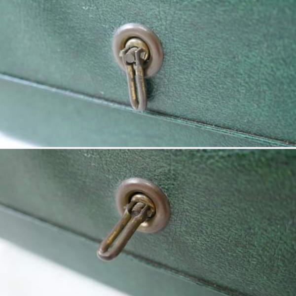 ダークグリーンのビニール製ケース中に、靴磨きブラシ4本・KIWIブーツポリッシュ・KIWIレザーポリッシュ・靴磨き布、の8点のお手入れ道具が入っています。