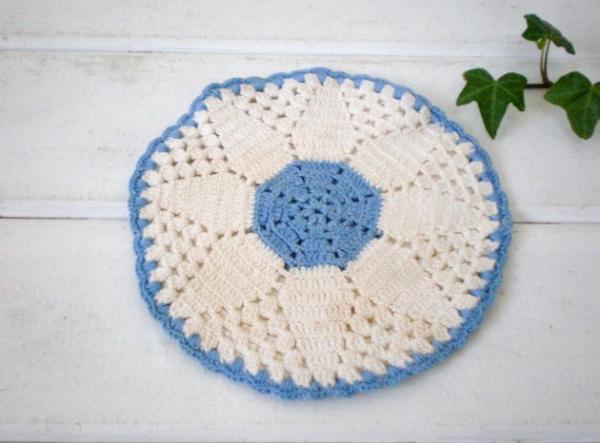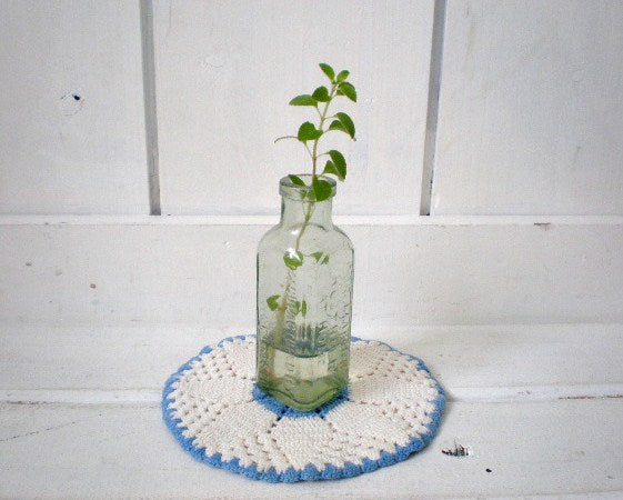 カリフォルニアでみつけました・・手編みのヴィンテージ・ポットホルダーです。ドイリーとしてボトルを飾ったり・・鍋敷き・・キッチンのディスプレイなどに・・♪