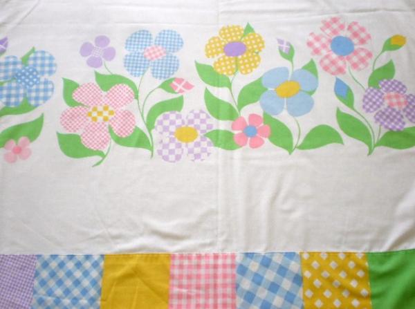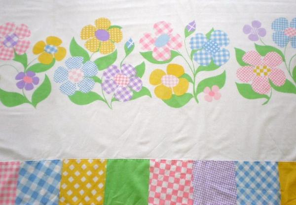 ホワイトベースのシーツで、裾(約60cm)にパッチワーク柄&花柄のキュートなプリントが入っており、それ以外は白地となります。