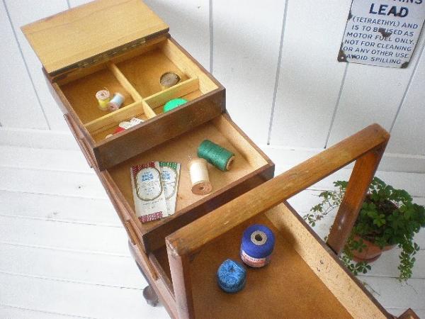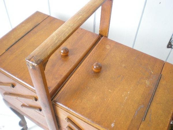 木製 脚付きアンティーク・ソ-イングボックス・裁縫箱(キャスター付き)USA