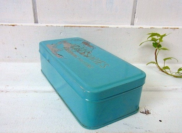 アメリカでみつけました・・ミシンの付属品が入っていた水色のアンティーク・ティン缶です。