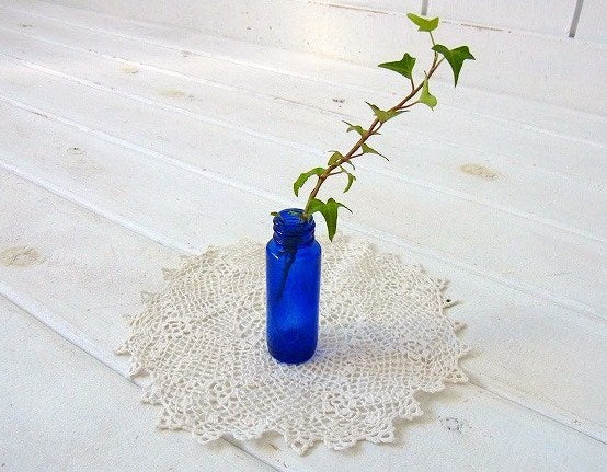 アメリカでみつけました・・ブルーの小さなヴィンテージ・ガラスボトルです。