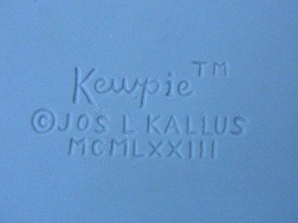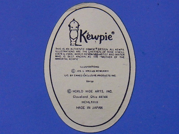 背面のラベルに【ILLUSTRATIONS JOS. L. KALLUS MCMLXXIII LIC. BY CAMEO EXCLUSIVE PRODUCTS INC.】【WORLD WIDE ARTS, INC. Clevelond. Ohio 44144 MCMLXXIII MADE IN JAPAN】と記載があり、ラベル下に【Kewpie JOS L KALLUS MCMLXXIII】と刻印がございます。