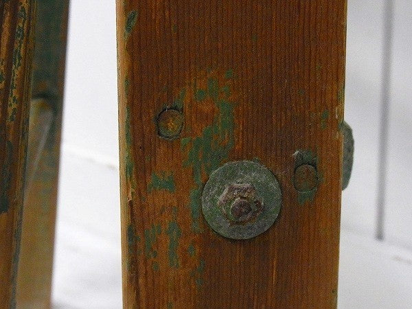 アメリカでみつけました・・緑色のペンキの剥げたアンティーク・木製・ステップラダー(脚立・踏み台)です。