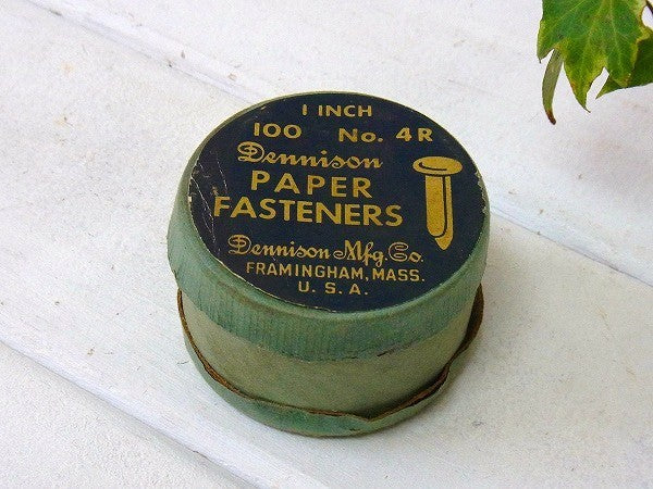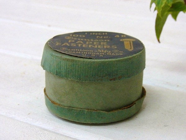 アメリカでみつけました・・『Dennison Mfg Co.』の【PAPER FASTENERS】割れピン(留め金具)が入っていた、丸い小さなヴィンテージ・紙箱です。