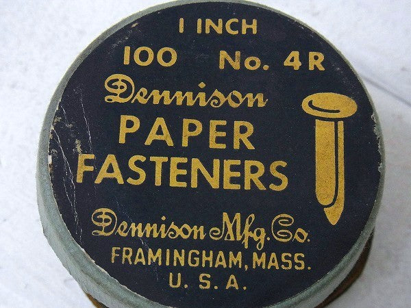 蓋のラベルにゴールド文字で【1 INCH 100 No.4R Dennison PAPER FASTENERS Dennison Mfg. Co. FRAMINGHAM, MASS. U.S.A.】と文字が入っています。