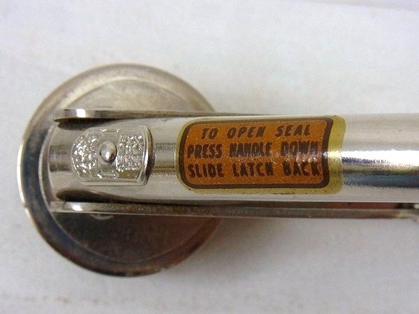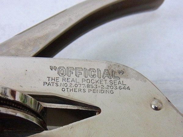 ハンドルサイドに【“OFFICIAL” THE REAL POCKET, SEAL PATS, NO.2,077,853-2,203,644 OTHERS PENDING】の刻印、ハンドル上部に【TO OPEN SEAL PRESS HANDLE DOWN SLIDE LATCH BACK】のラベルが付いております。