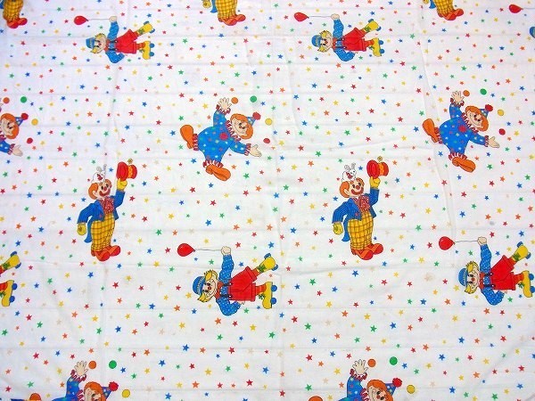 アメリカで見つけました・・ピエロ柄のヴィンテージ・USEDフラットシーツ(ハーフサイズ)です。