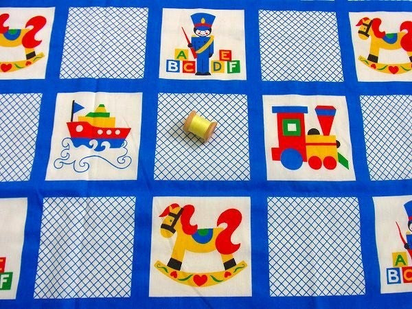 木馬や汽車・兵隊の船などの可愛いオモチャ柄プリントです。