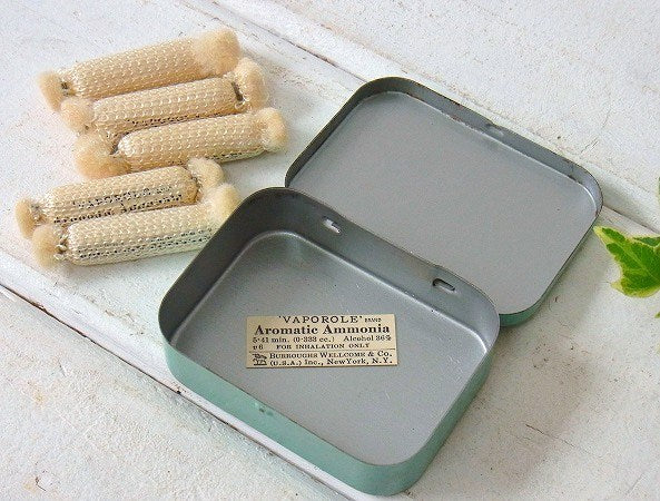 アメリカで見つけました・・『VAPORLE AROMATIC AMMONIA』の小さなヴィンテージ・ティン缶です。