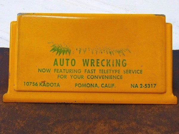 イエローのクリップ部分に【AUTO WRECKING NOW FEATURING FAST TELETYPE SERVICE FOR YOUR CONVINIENCE 10756 KADOTA POMONA, CALIF. NA 2-5317】と文字が入っています。