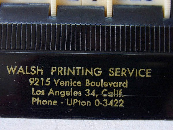 ブラック色ベースにゴールド色で【WALSH PRINTING SERVICE 9245 Venice Boulevard Los Angeles 34, Calif. Phone-UPton 0-3422】とプリントが入っております。