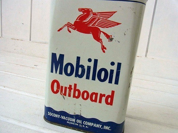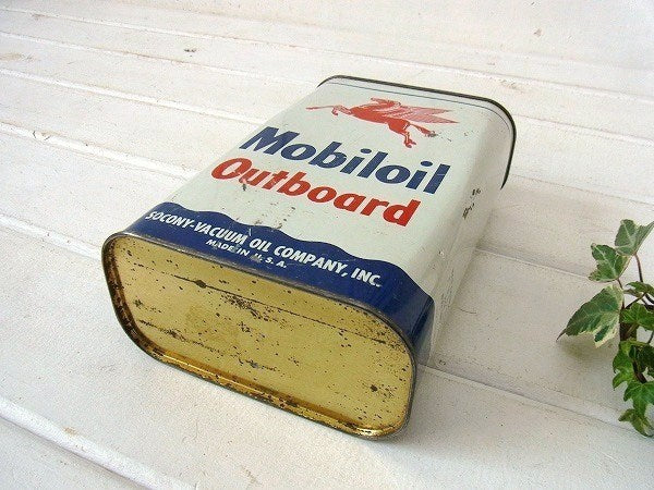 ホワイトベースにシンボルマークのペガサスと、【Mobiloil Outboard SOCONY-VACUUM OIL COMPANY, INC. MADE IN U.S.A.】の文字、上部に【MOTOR OIL】とエンボスが入っております