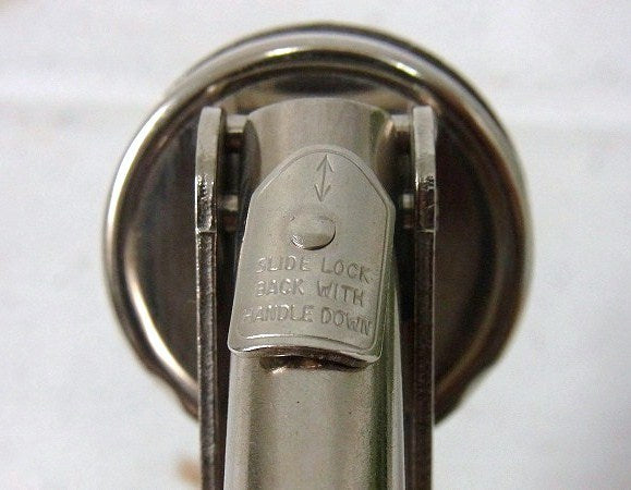 ハンドルを握り,トップ部分に【⇔ SLIDE LOCK BACK WITH HANDLE HANDLE DOWN】上の金具を下ろすと、ハンドルがロックの状態になります。