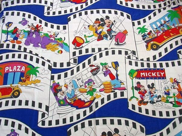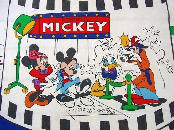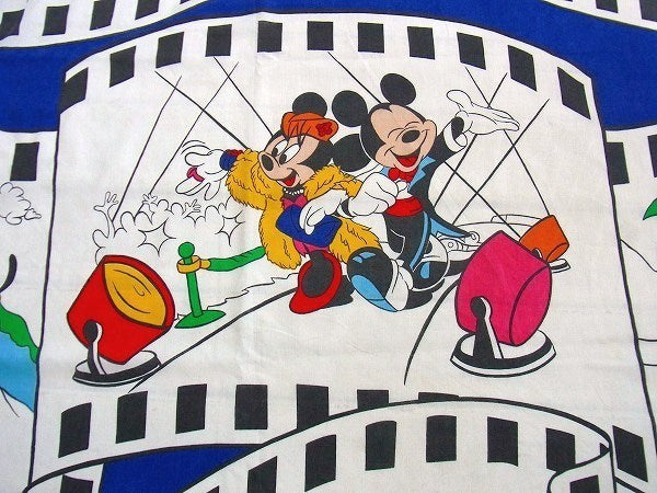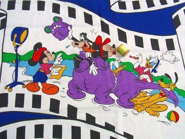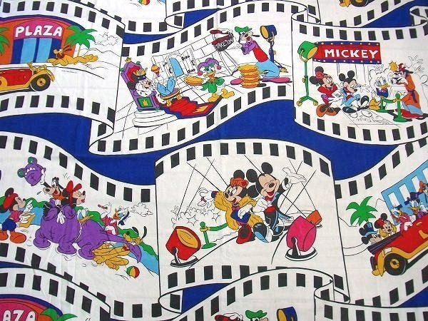 アメリカで見つけました・・ディズニー『ミッキー&フレンズ』のフィルム柄・ヴィンテージ・USEDフラットシーツ(ハーフサイズ)です。
