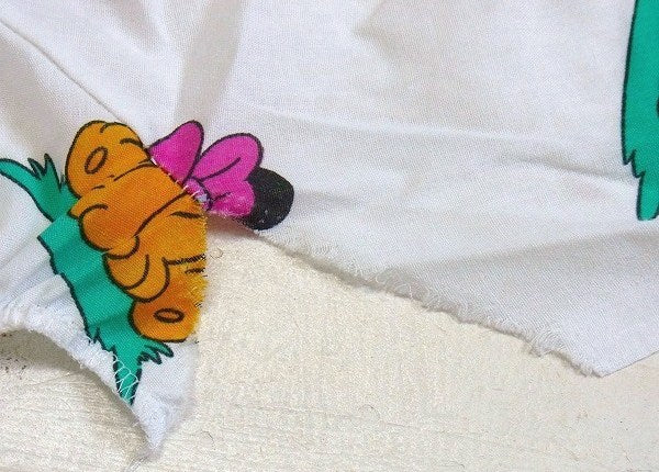 プリントの発色良く、生地もしっかりしておりますが、角2箇所にヤブレ(画像参照)がございます。