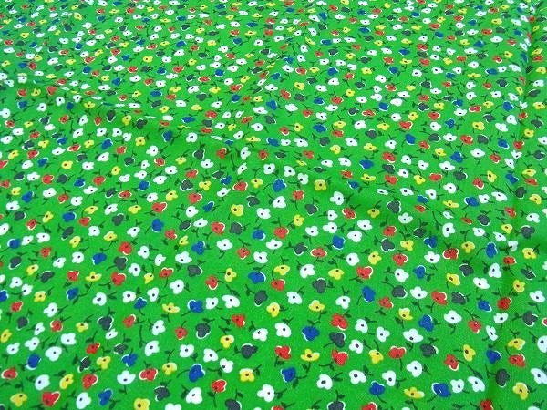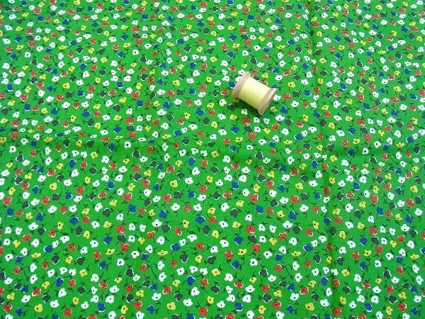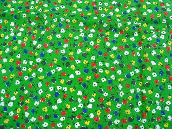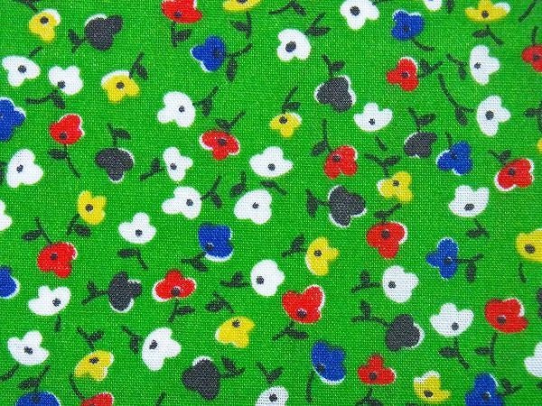 グリーンベースに、白×赤×黄×青のレトロな小花柄プリントです。