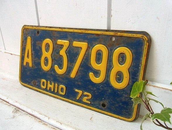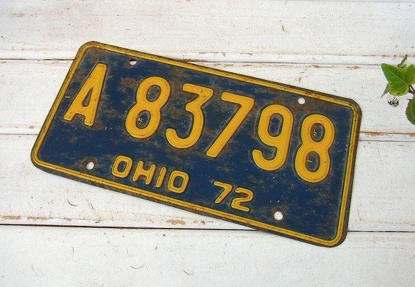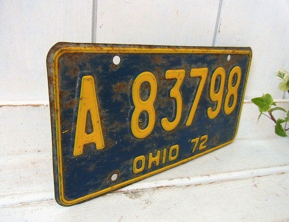アメリカで見つけました・・アメリカ・オハイオ州の1972年・ヴィンテージ・ナンバープレートです。 ブルーボディにイエローで【A 83798 OHIO 72】とエンボス文字が入っております。 年代を経たシャビーな雰囲気がございます。 留め穴は4箇所ございます。 お部屋やガレージのディスプレイ・インテリア・・コレクションなどに・・♪ 経年により多少のヨゴレ・スレ・キズ・サビございます。 画像(写真)でのご判断を宜しくお願い致します。 ■size  :約 W30.5cm×H15cm   ■コンディション : ★★★★☆ ■メール便¥160対応可(補償なし) ※ご注文の際、お手数ですがメッセージ欄にメール便・希望とご記入下さい。新たにお見積もりをメールにてお知らせさせていただきます。