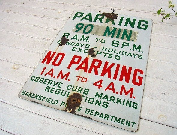 緑色の文字で【PARKING 90 MIN. 8A.M. TO 6P.M. SUNDAYS-HOLIDAYS EXCEPTED NO PARKING】&【OBSERVE CURB MARKING REGULATIONS BAKERSFIELD POLICE DEPATMENT】赤色の文字で【NO PARKING 1A.M TO 4A.M.】 とございます。