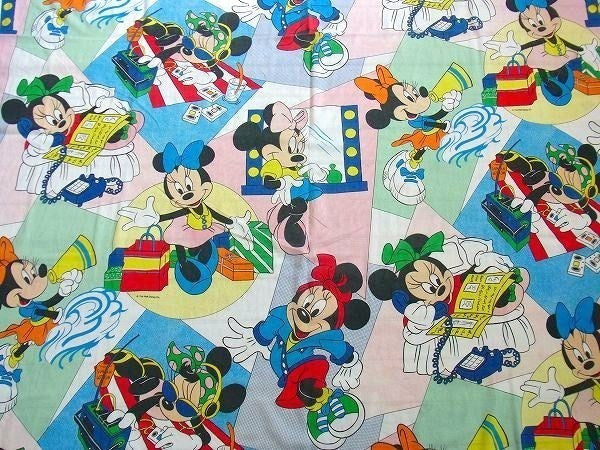アメリカで見つけました・・ディズニー『ミニーマウス』のヴィンテージ・USEDフラットシーツ(ハーフサイズ)です。 ミニーマウスがのダンスやチアリーダー・お買い物など、6パターンのカラフル&キュートなプリントです。 キャラクター生地として・・お洋服や小物・バッグのリメイク・ハンドメイド・・パッチワークなどに・・♪ MADE IN U.S.A. 経年による多少の使用感・数箇所に小さなヤブレ・1箇所にペン跡等ございます(画像参照)。 日本国内にてお洗濯済みです。 サイズのご参考に・・糸巻きの高さは約3cmです。 画像(写真)でのご判断を宜しくお願い致します。 ■SIZE:約 W169cm×H112cm         ■コンディション : ★★★☆☆ ■メール便¥160対応可(補償なし) ※ご注文の際、お手数ですがメッセージ欄にメール便・希望とご記入下さい。新たにお見積もりをメールにてお知らせさせていただきます。