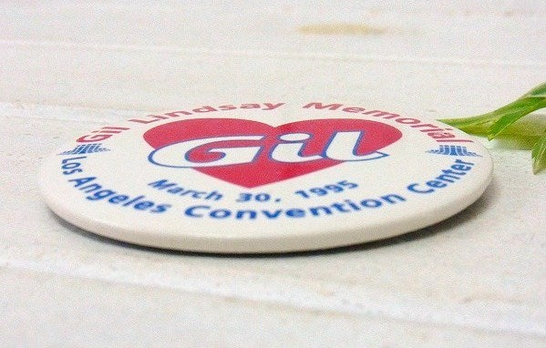 アメリカで見つけました・・『Gil Lindsay Memorial』のヴィンテージ・缶バッジです。