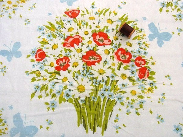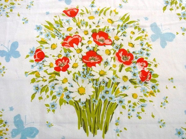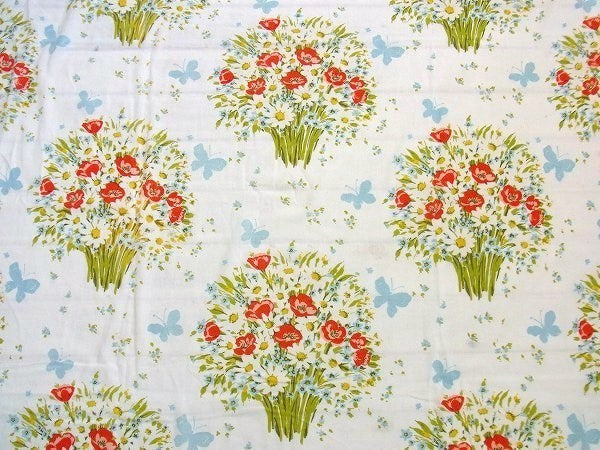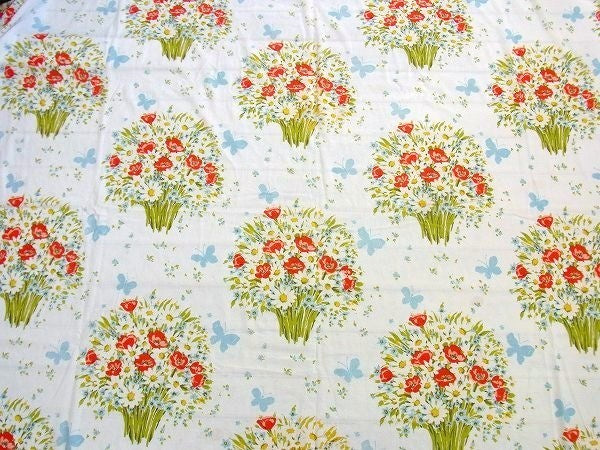 アメリカで見つけました・・花束&蝶々柄のヴィンテージ・USEDフラットシーツ(ハーフサイズ)です。