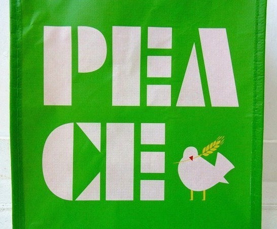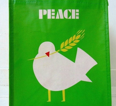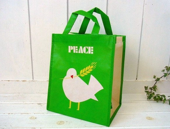 【PEACE(平和)】の文字と、麦をくわえた鳥の絵柄が入った、黄緑色のカラフルなデザインです。