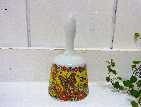 陶器製・蝶々&花柄・デッドストック・ヴィンテージ・ベル/呼び鈴(イエロー)