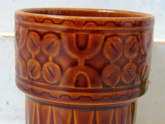 ツヤのあるブラウン色に、コーヒー豆のような模様と幾何学模様のレトロなデザインです。