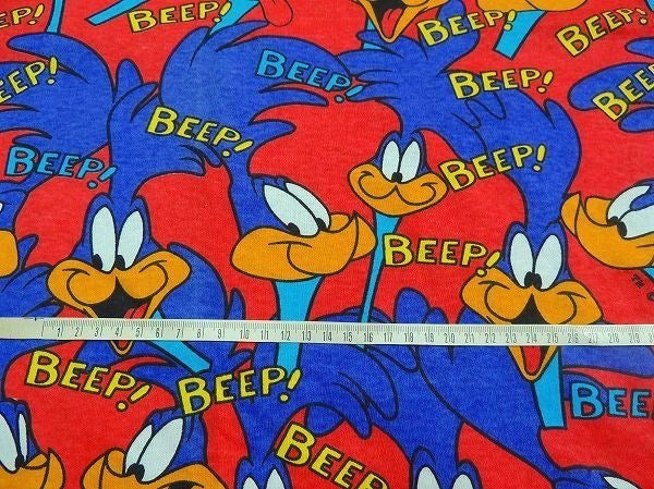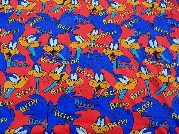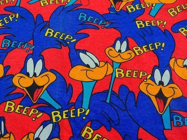 赤色ベースに“ミッミッー(Beep! Beep!)”と鳴いているロードランナーの、カラフルな総柄プリントです。