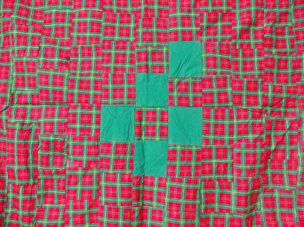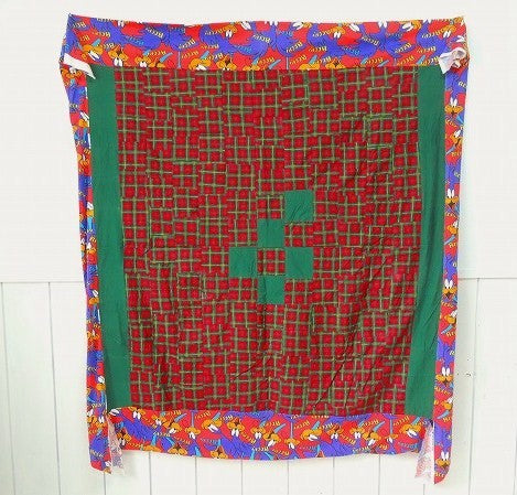裏地は、赤色×緑色のタータンチェック柄・パッチワーク製で、子供用ベッドサイズのベッドスプレッド(ベッドカバー)として使用されていたとお品と思われます。