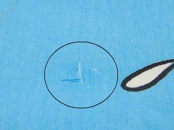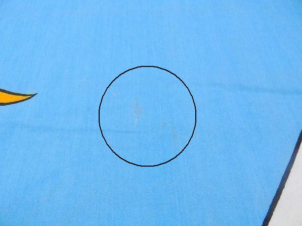 プリントの発色良く、生地もしっかりしておりますが、数箇所に薄いヨゴレ・小さなイタミ箇所が見られます(画像参照)。