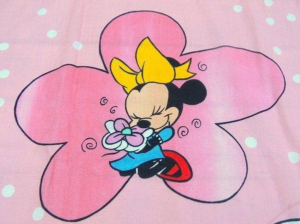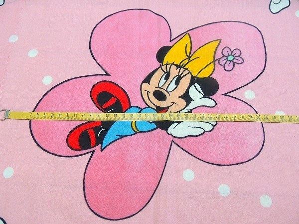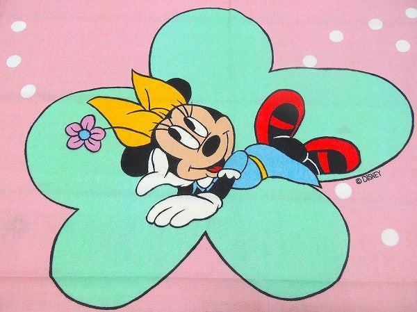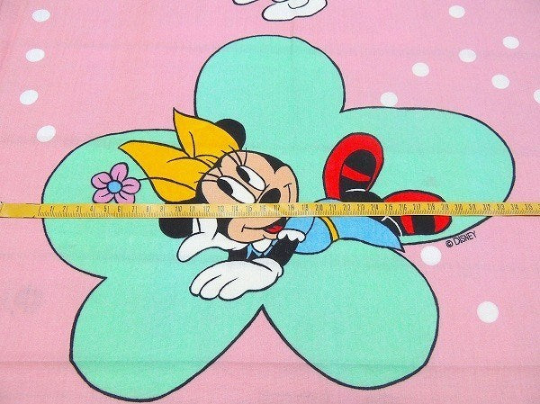 ピンク色ベースに、ペパーミントグリーン&ピンク色のお花の中に入った可愛いミニーちゃんと蝶々のプリントです。