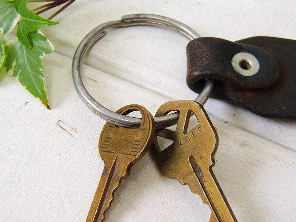USA ビンテージ 革製 ひまわり柄 レザーキーホルダー &真鍮製の古鍵 2本付きです。