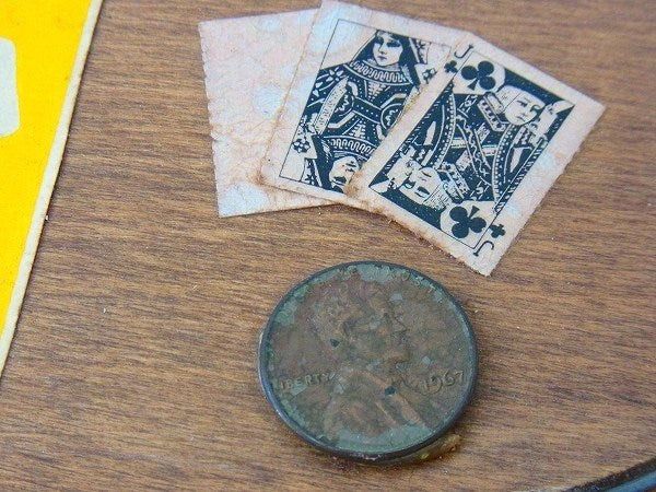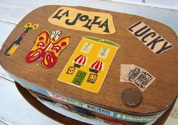 蓋に【LA JOLLA】や【LUCKY】の文字、蝶々や建物・トランプなどのシールでデコレーションされております。