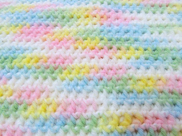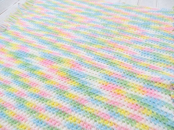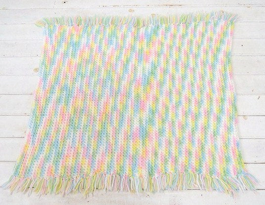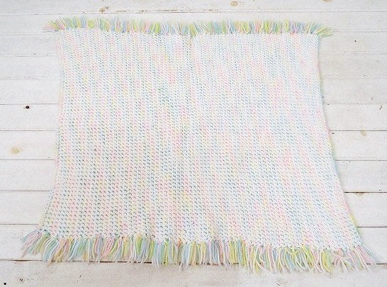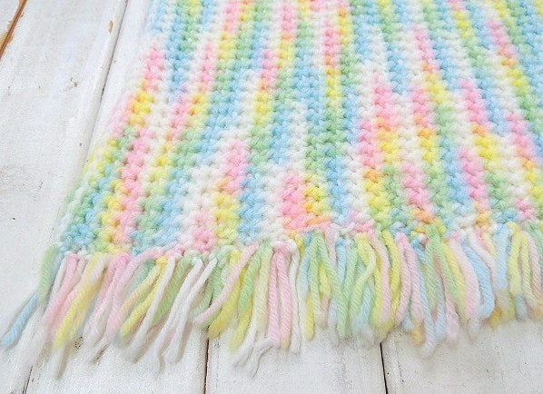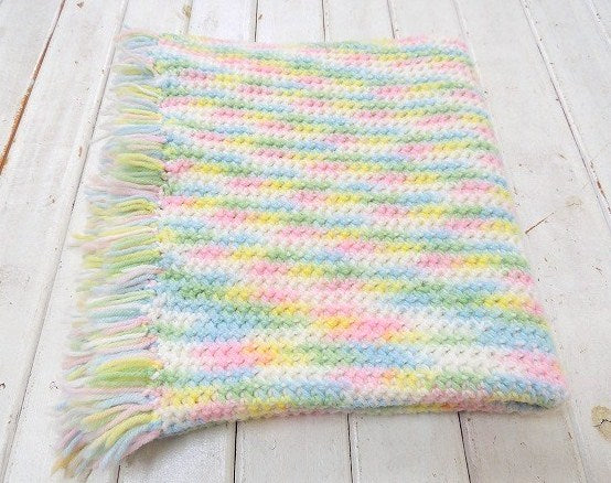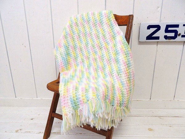 パステルカラー・フリンジ付き・ヴィンテージ・ニット・ベビーブランケット/ひざ掛け USA