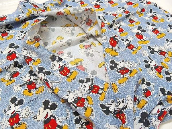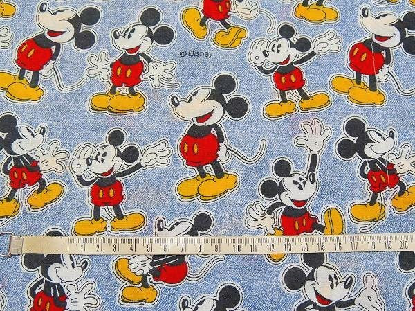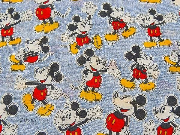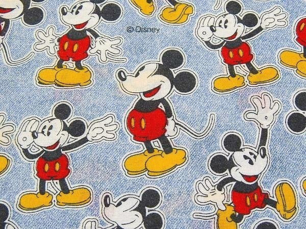 デニム柄ベースに、いろいろな表情をしたミッキーマウスの総柄プリントです。