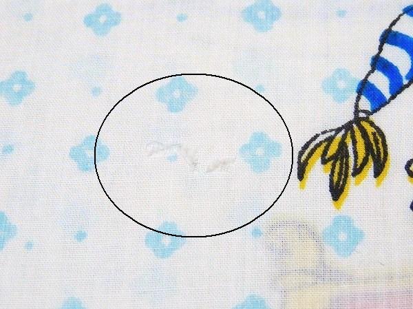 プリントの発色良く、生地もしっかりしておりますが、1箇所にヤブレ部分がございます(画像参照)。