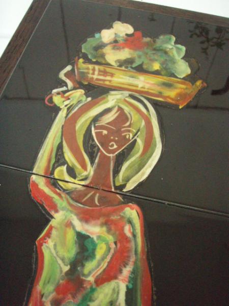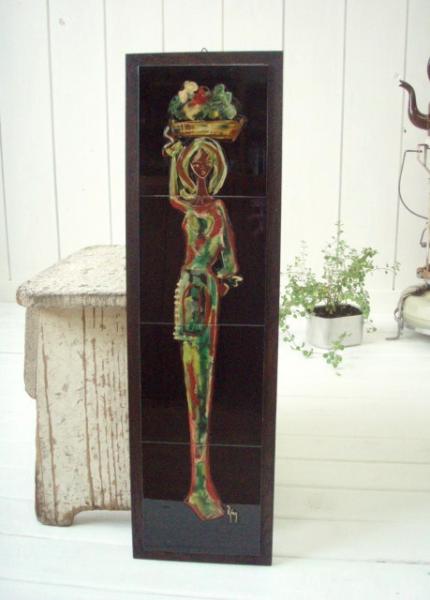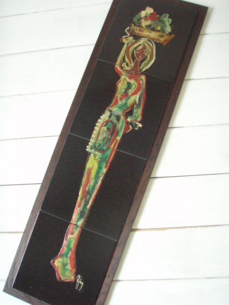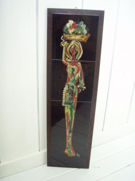 ブラックベースのホーランドタイルに、フルーツを頭にのせた黒人の女性が描かれており、カラフルな色彩が引き立ったとっても素敵なアートです♪