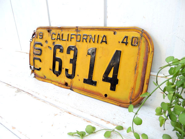 アメリカ西海岸で見つけました・・クールな1940年/CALIFORNIA/カリフォルニアの弾痕付き ヴィンテージ・ナンバープレートです。イエローに【1940/CALIFORNIA/SC/6314】とブラックのエンボス文字が入っております。
