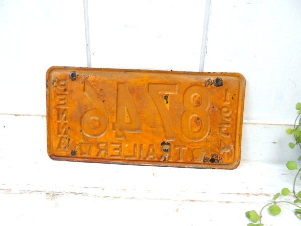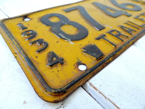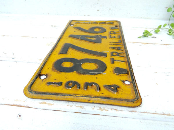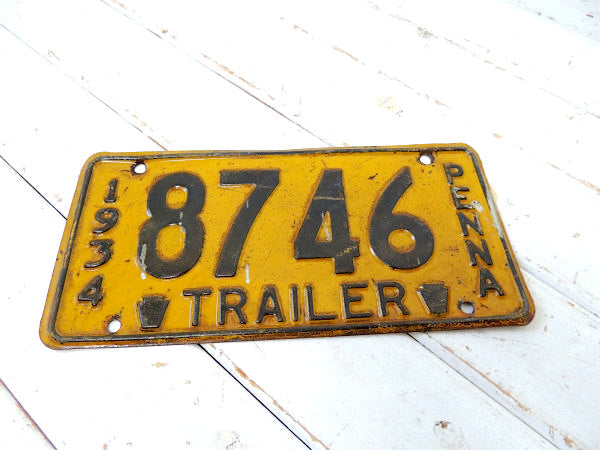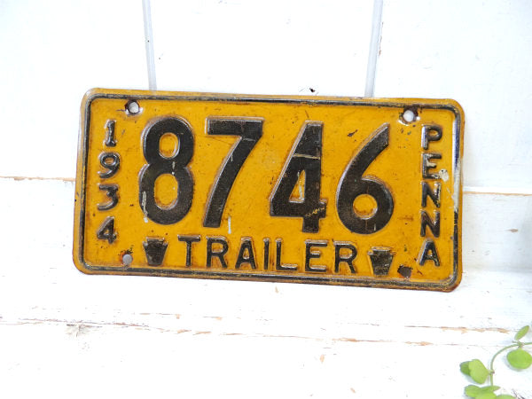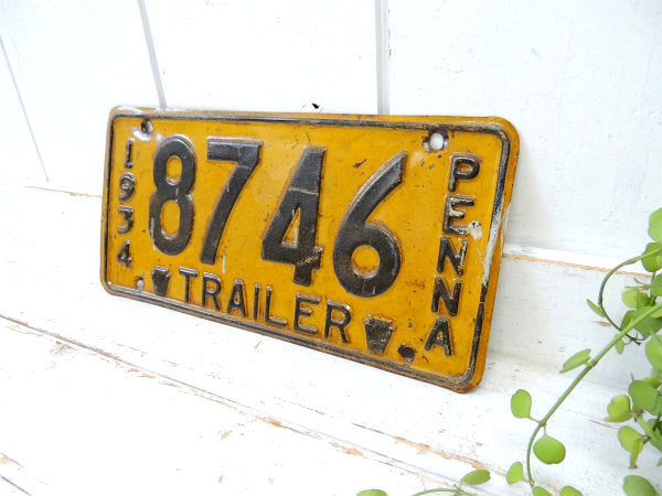 アメリカ西海岸で見つけました・・希少価値 1934年~1937年限定 アメリカ北東部 ペンシルベニア州:Commonwealth of Pennsylvania TRAILER・トレーラーのずっしり重たい ヴィンテージ・ナンバープレートです。イエローに【1934/8746/PENNA/TRAILER】とブラックのエンボス文字が入っております。